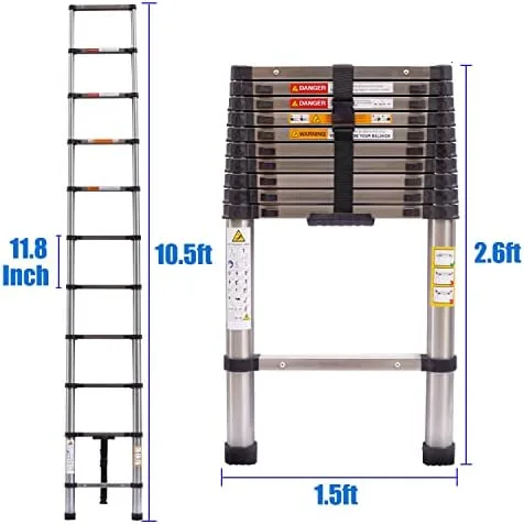 Multi-Purpose Telescoping Ladder 3.2M 10.5ft Extension Ladder Adjustable Height with Anti-Slip Feet Stainless Steel Telescoping Ladder 330 LB Load Capacity
