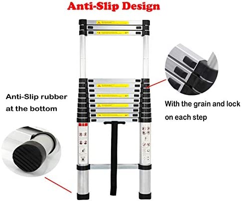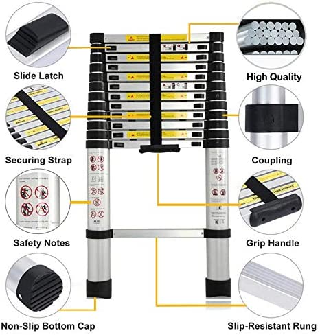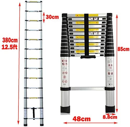 This 12.5ft/3.8M Telescopic Aluminum ladder would be the great helper for both indoor household use and outdoor activities. Extendable design, convenient to use and easy to carry around. The ladder is safe and compact, Approved by European Safety Standard EN131