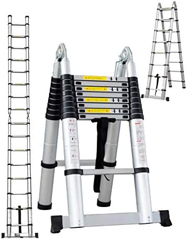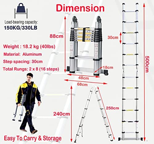 3.-Size-(see the size image)Fully Extended 500cm /16.4ft to a handy 2.89ft/88cm,Step spacing :1ft/30cm,(Open- 16Steps-Bottom width 2.23ft/67cm,Vertical Length 16.4ft/500cm,top width 1.57ft/48cm)(A-frame height 8.2ft/250cm): you can store (Closed Height:2.89ft/88cm,width:2.23ft/67cm)