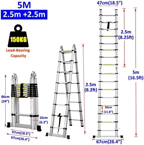 🌲【Height Adjsutable Aluminum Ladder】The independent lock allows you to adjust height from 3.1ft to 16.5ft. Adjusting rung by rung in 1 ft increments to reach and retract any desired height. Our telescopic extension ladder is made of premium quality aluminum alloy, which is corrosion-resistant, rust-resistant, and long service life. Manufactured to the highest standard, this telescopic ladder conforms to EN131 standards.