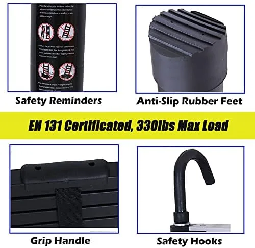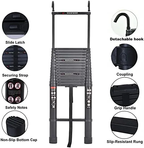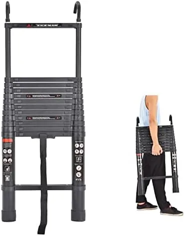 ▶Safe and Compact: The telescoping ladder comes with 2 detachable hooks for secure fixing. Featuring durable aluminium design, industrial-grade height-locking latches and solid anti-slip rubber feet on the bottom of ladder. The telescopic ladder is approved by safety standard EN131.