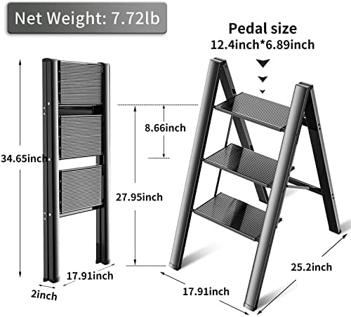 【SPACE SAVING】The 3-step ladder is only 2’’ wide when folded, saving your space. It is easy to carry and suitable for indoor or outdoor use. It folds compactly to fit narrow places. When idle, it can be leaned against a wall or corner, under a bed or cabinets can be placed and stored