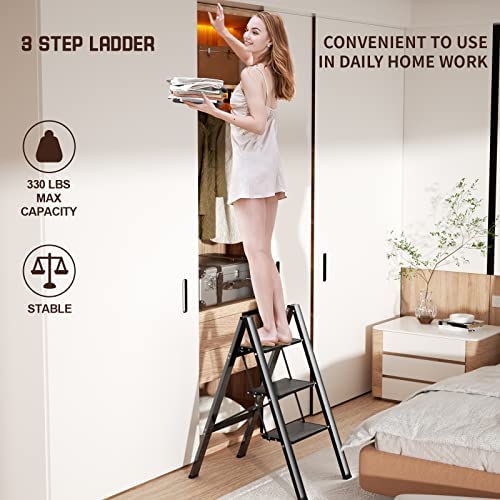 3 Step Ladder Aluminum Lightweight Folding Step Stool Wide Anti-Slip Pedal 330 Lbs Capacity Household Office Portable Stepladder,Black