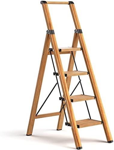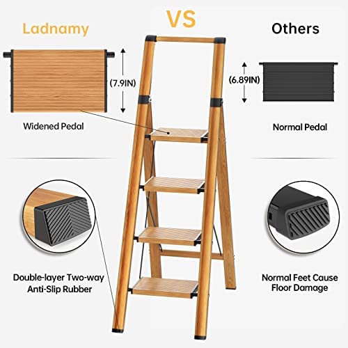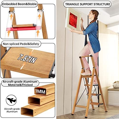 4 Step Ladder, Aluminum Folding Step Stool W/Wide Pedal, Lightweight Safety Step ladder for Adults, Decorative Storage Shelf Ladder for Kitchen Office Library, 330IBS Capacity Step Ladder, Woodengrain