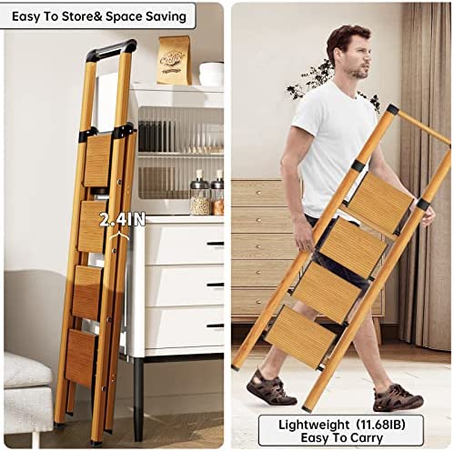 【LIGHTWEIGHT& SPACE SAVING】This compact folding ladder is lightweight enough to carry with one hand easily. The slim foldable 4 step stool is only 2.36″ after folding completely flat, saving space, and easy to transport and carry anywhere. Easy to store in the closet, in a garage, against the wall, under the bed, under the sofa, or in any corner which is not take up too much space
