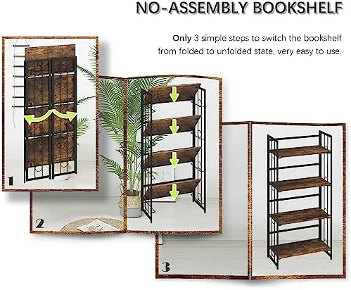 4NM No-Assembly 4 Tiers Folding Bookshelf Storage Shelves Vintage Bookcase Standing Racks Study Organizer Home Office – Rustic Brown and Black