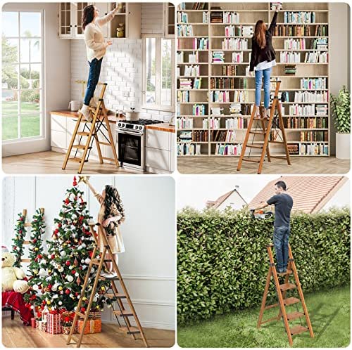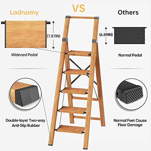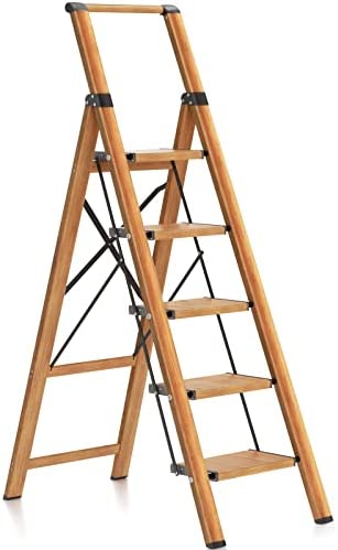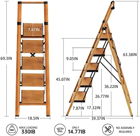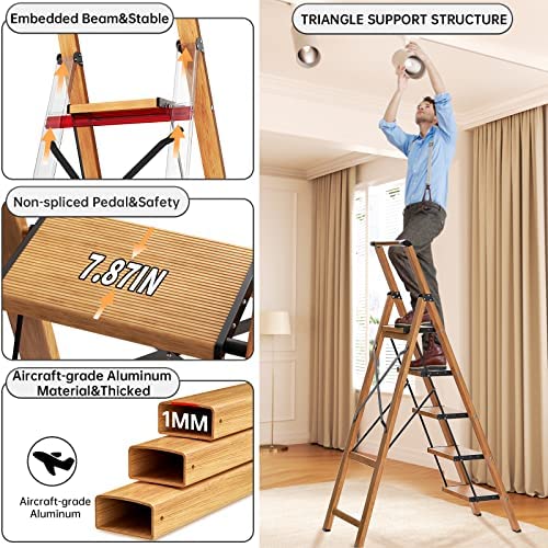 5 Step Ladder, Aluminum Folding Step Stool W/Wide Pedal, Lightweight Safety Step ladder for Adults, Decorative Storage Shelf Ladder for Kitchen Office Library, 330IBS Capacity Step Ladder, Woodengrain