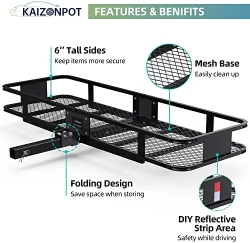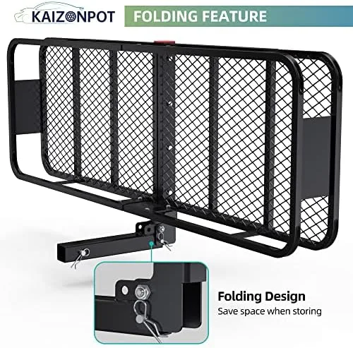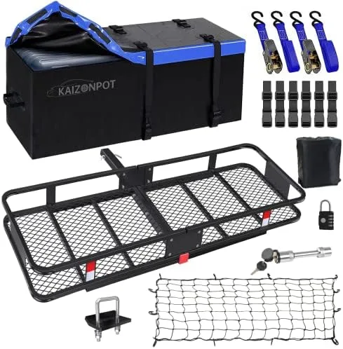 KAIZONPOT 60" x 20" x 6" Trailer Hitch Cargo Carrier Hitch Mount & 16cu Waterproof Cargo Bag, Folding Vehicle Cargo Basket 500lb Capacity with Hitch Stabilizer, Net and Straps