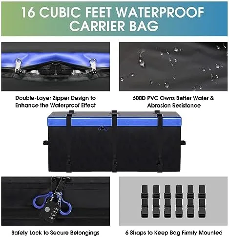 【16 Cu Ft CARGO BAG SET】 Includes 16 Cu Ft (58″ x 19″ x 24″) waterproof cargo carrier with carry bag, 6 buckle straps and a safety bag lock, making it easy to use and store with mess-free