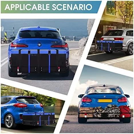 【EXTRA STORAGE CAPACITY】 The car hitch cargo carrier adds about 8 ft² of instant storage space to your vehicle, which is great for use for all occasions such as camping road trips, or tailgates. The hitch rack cargo carrier measures about 60 in. L x 20 in. W x 6 in. H