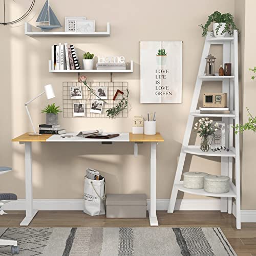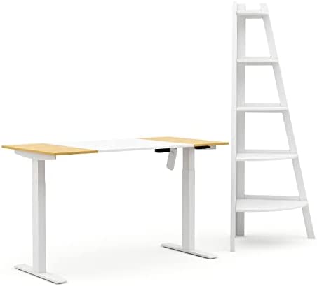 Includes one (1) desk and one (1) bookshelf. ELECTRIC POWERED: simple up and down button control to lift or lower the table. SPACE-SAVING: corner design maximizes vertical and corner space. CONVENIENT: Adhesive cord management. Contemporary. Color: White and Light Maple. Materials: steel, solid wood, and veneer. (5) five rounded shelves. Kid-friendly with smooth-edge fronts. Sturdy angled legs. Back corner base panel for additional structural integrity. Table top thickness: 0