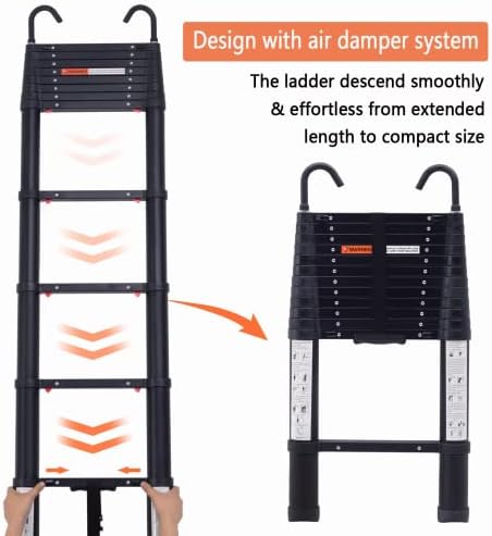 Alohappy Telescopic Ladder with Hooks, 12.75FT One Button Retraction Telescoping Ladder with Non-Slip Feet Slow Down Design Portable Extension Ladder for Household and Outdoor, 330lb Capacity (Black)