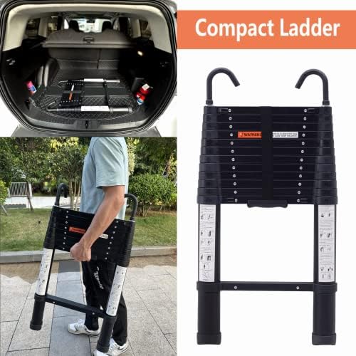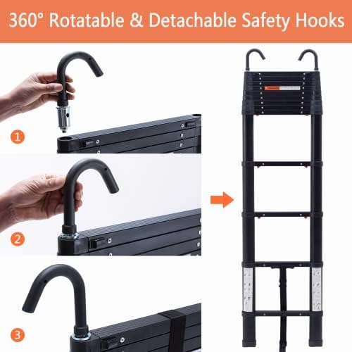 【Double Safety Hooks】 Add 360°rotatable and removable hooks making the ladder safer to use. The sturdy and durable metal non-slip hooks of the telescoping extension ladder can be hung on items within the diameter of 3″(7.5cm) to make the telescope ladder more stable and safer when you working.