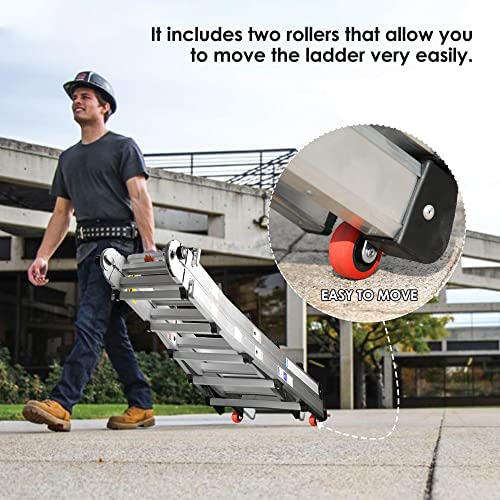 Aluminum Extension Ladder, Max Extension of Telescopic Ladder 22 ft, Multi-Purpose Collapsible Ladder Extension with Two Wheels,Rated Load 300 Lbs (Load Capacity Type IA)