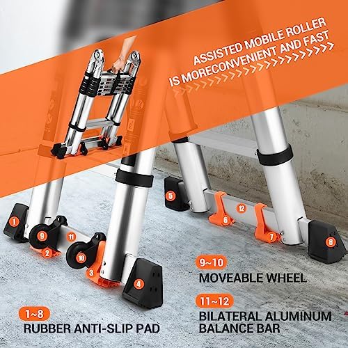 Flexible retraction to save space – The extension ladder can be stored under a sofa / bed, behind a door, or in a storage room / trunk of a car. Telescoping Ladder can be retracted at any length, with a fully extended length of 14.4 FT and a fully retracted height of 3.02 FT. It can be also fully folded when not in use, real space saving, convenient and practical.