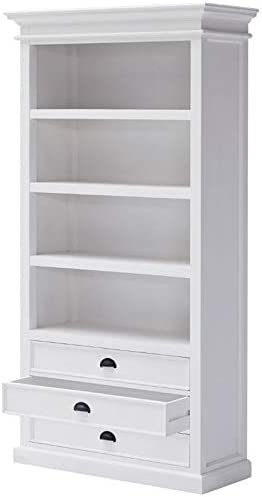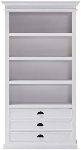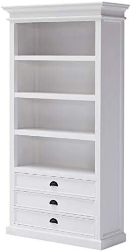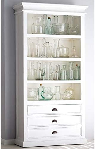 This shelving unit can display all of your favorite books or collectibles. The semi gloss white painted finish highlights detailed molding. 3 Drawers at base, with antique brass pulls, offer additional storage for linens or personal items.