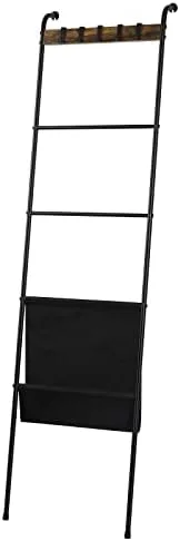 Blanket Ladder Decorative Ladder Holder with 5 Hooks and Pocket 5 Tier Farmhouse Metal Wall Leaning Towel Rack Stand for Bathroom Living Room Laundry Room, Black