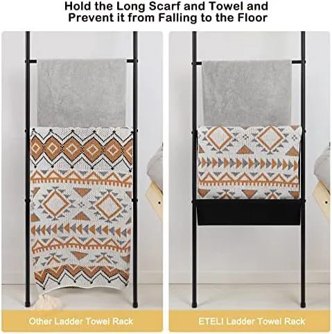 【Decorative Blanket Ladder】Made of matte black iron and rustic brown MDF, ETELI towel rack stand is perfect for organizing your bath towels, scarves, blankets, newspapers. The blanket ladder is a simple, functional and classic furniture for your rooms, such as bathroom, living room, bedroom and laundry room.
