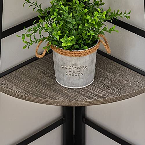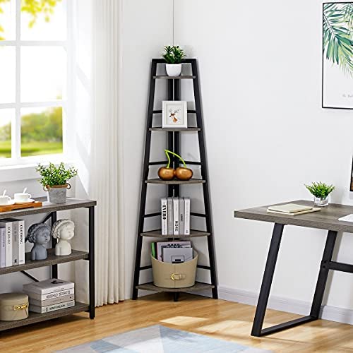 BON AUGURE Industrial Corner Shelf Stand, 5-Tier Wood Corner Bookshelf, Rustic Tall Corner Ladder Bookcase for Living Room and Office (Dark Gray Oak)