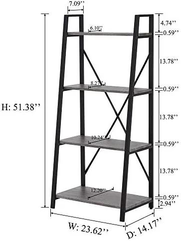Dimensions & Material: 14.17” D x 23.62” W x 51.38” H. 13.78 inch distance between each shelf. The ladder bookshelf is constructed with high quality MDF (engineered wood) and metal tube frame. Not solid wood. Adjustable levelers help strengthen the stability and keep balance.