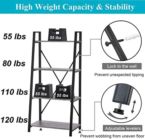Maximal Weight Capacity: From top to bottom shelf: 55 lbs / 80 lbs / 110 lbs / 120 lbs. This ladder bookcase is super sturdy and can service for long life.