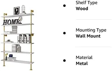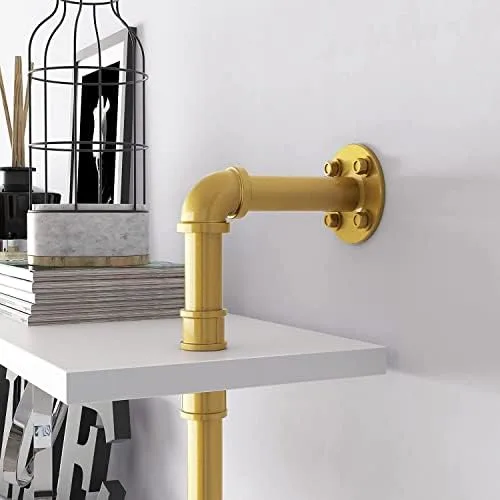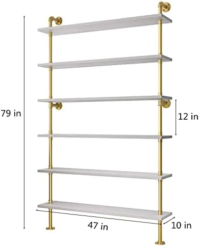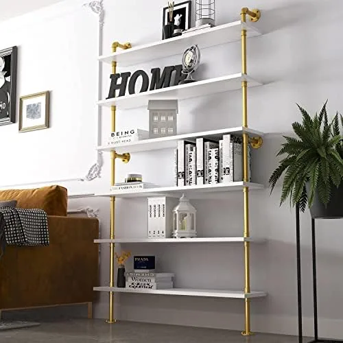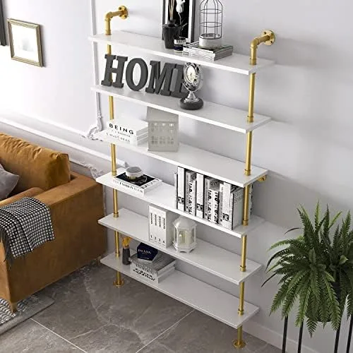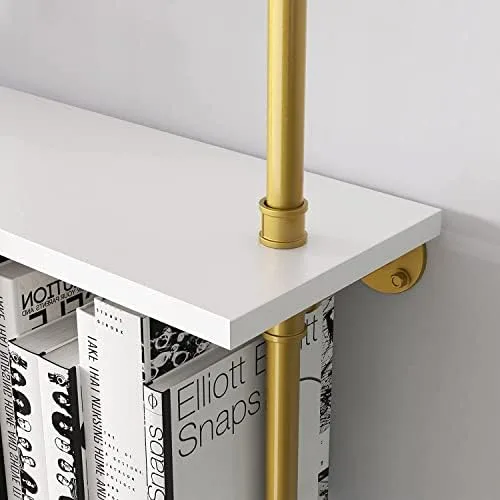 BOSURU Gold Wall Bookshelves with White Shelves Rustic Industrial Ladder Bookshelf, Industrial Pipe Shelf for Living Room Decor and Storage, Gold Bookcase