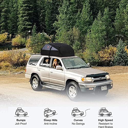 【HIGH DENSITY 1000D PVC】Features triple-layer high density 1000D PVC fabric. This material is 2 times stronger than 500D PVC fabric, which most other rooftop bags adopts and can easily rip. The coated surface can effectively protect your luggage against rain, grit, snow, wind and sun on the road.