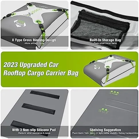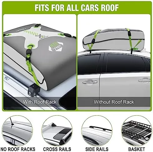 【Universal Fit】Our car rooftop cargo carrier bag is meticulously designed to fit various car models. Whether you own a compact car, SUV, van, or crossover, our cargo carrier bag will seamlessly match your vehicle. Installation is quick and hassle-free, requiring no additional tools. In just a few minutes, you can complete the loading process and embark on your journey.