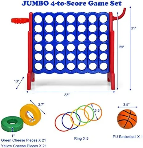Costzon Giant 4-in-A-Row, Jumbo 4-to-Score Giant Game w/Basketball Hoop, Ring Toss, Quick-Release Slider, 42 Jumbo Rings, Indoor Outdoor Family Connect Game for Kids & Adults, Backyard Games