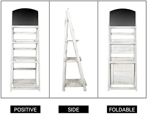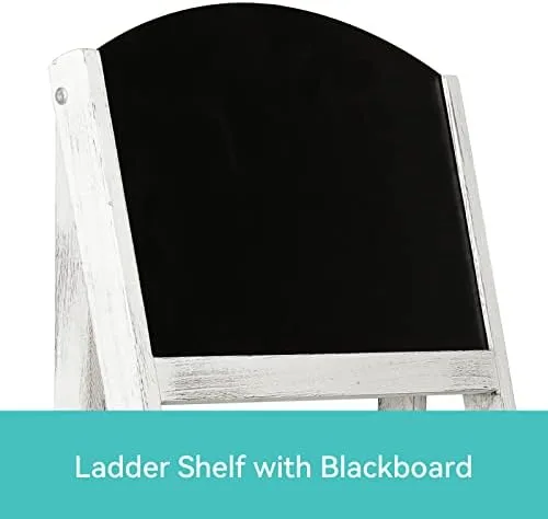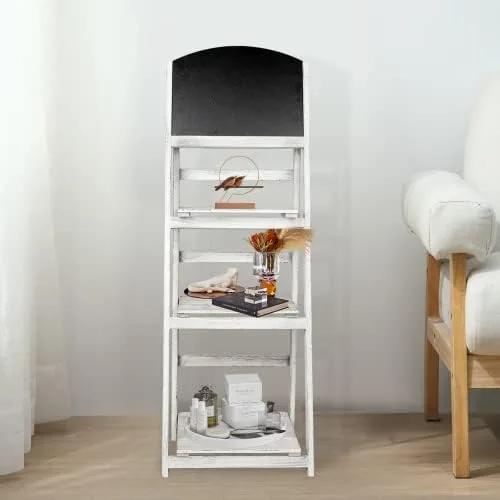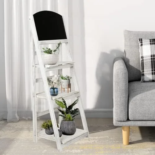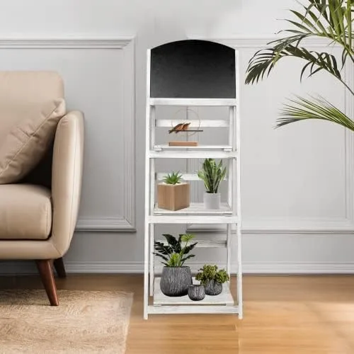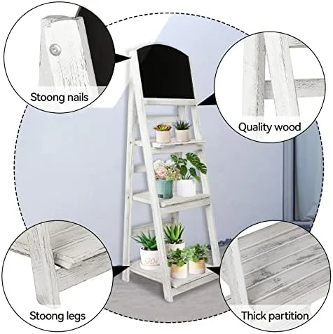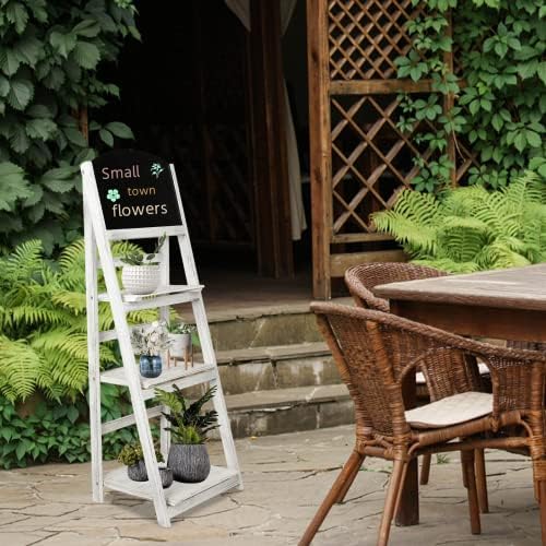 ECOMEX Foldable Ladder Shelf, Plant Stand, Ladder Shelf with Blackboard, Indoor Plant Stand, Ladder Bookshelf, Wood Rustic Ladder Shelf for Patio Garden Home Living Room Decor(White)