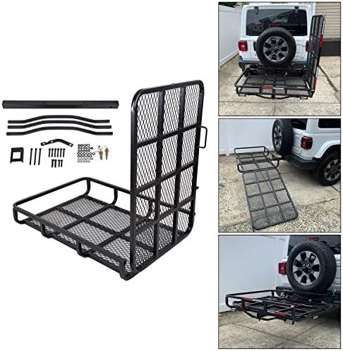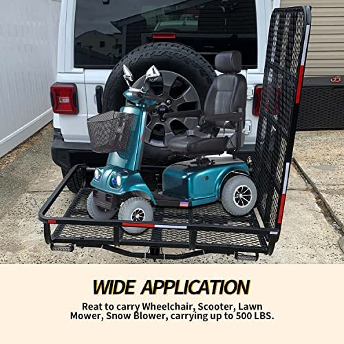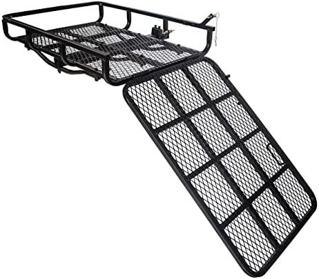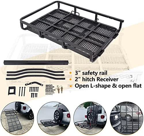 Function: This hitch-mounted and basket-style cargo carrier can be used as a carrier, great to carry wheelchair, scooter, lawn mower,carrying up to 500 lbs. Total weight: 73 Lbs.Widely use for transporation.