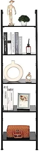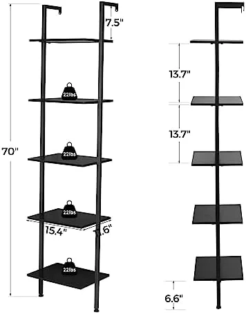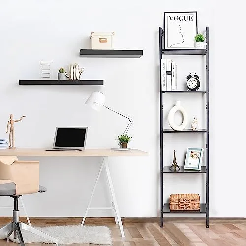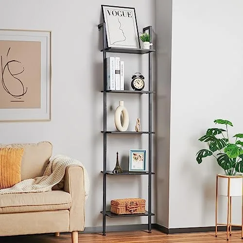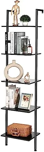 ELYKEN Ladder Shelf, 5-Tier Wood Wall Mounted Bookshelf with Metal Frame, Vintage Open Display Organizer Rack, Leaning Storage Shelves for Living Room, Bedroom, Home Office, Black