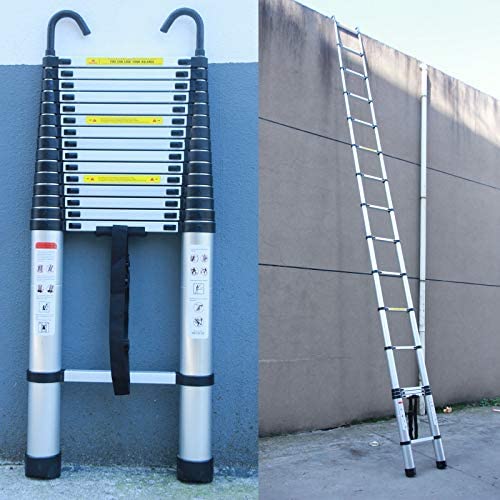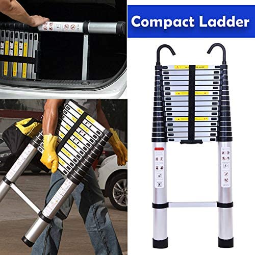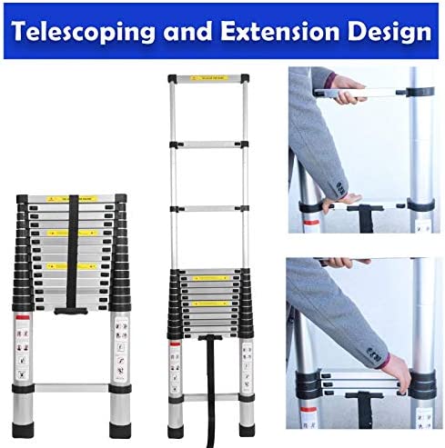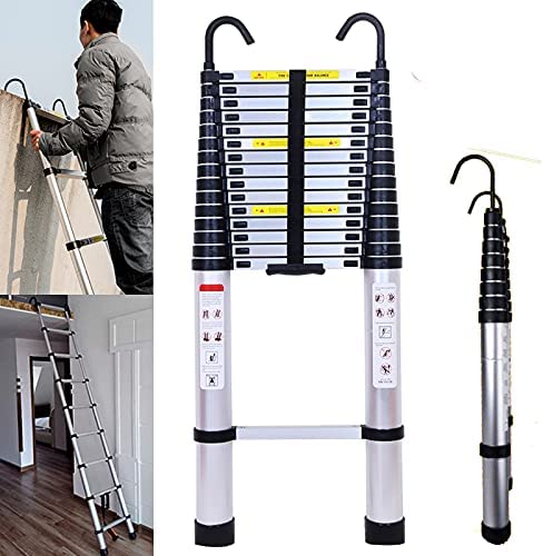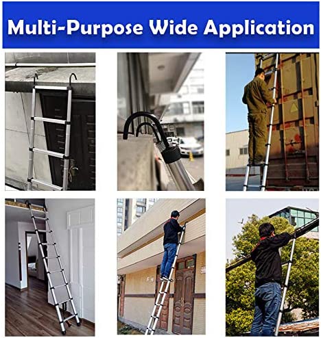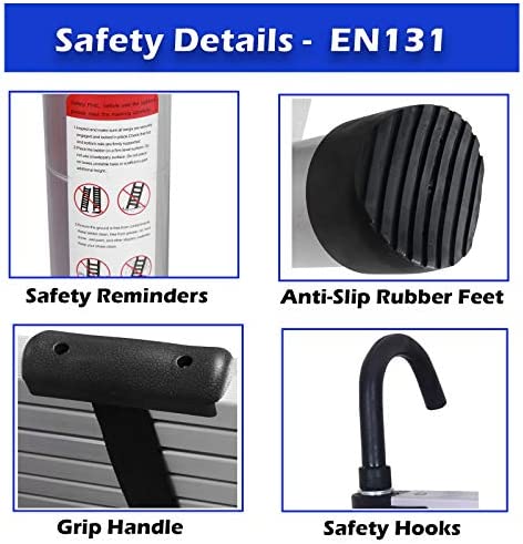 ▶Safe and Compact: Comes with 2 Hooks for secure fixing. Featuring durable aluminium design, industrial-grade height-locking latches and solid anti-slip rubber-tipped feet on the bottom of ladder step. The telescopic ladder is approved by safety standard EN131;
