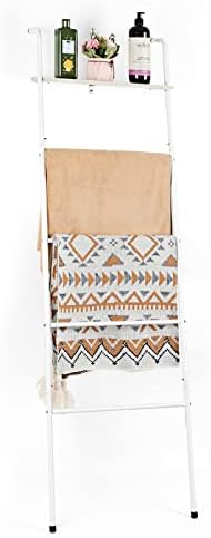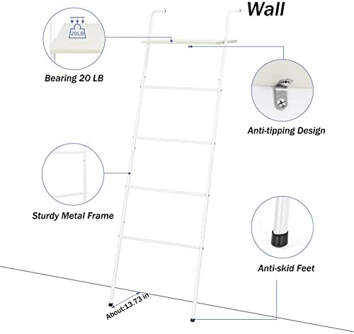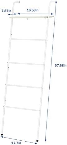 🏡【DIMENSIONS】Approximated Dimensions:17.7 X 7.87 X 57.68 inches. This leaning blanket ladder with four towel bars, so you can easily organize and display your quilts, towels, scarfs, and ties! Also, you can place green plants, decorations, books, or toiletries on the top storage shelf. Weight capacity up to 20 lb.
