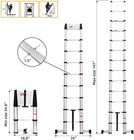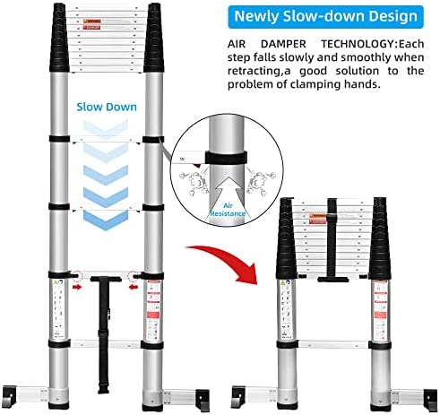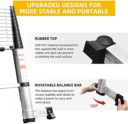 FEETE 12.5FT One-Button Retraction Telescoping Ladder, Aluminum Lightweight Extension Ladder w/Non-Slip Foldable Feet, Compact Collapsible Ladder for RV, Household, Outdoor, 330lbs Capacity