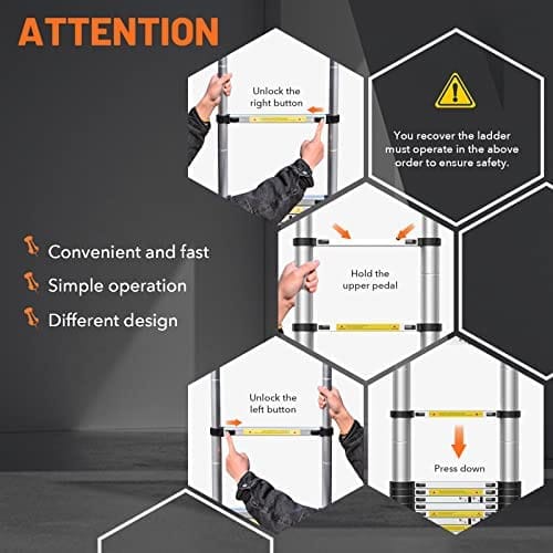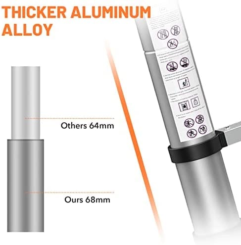 👍【Robust Frame & Anti-skid Design】 scientific and solid structure is adopted. Our telescopic ladder has passed the certification of safety standard EN131, and its load-bearing capacity is up to 330 pounds. In addition, the anti-slip cap is carved with deep horizontal stripes and ultra-wide steps to ensure your safe climbing.
