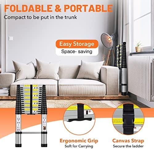 👍【Portable & Collapsible Design】 This collapsible and telescopic ladder is designed with storage belt and carrying handle, which is convenient for transportation and saves space. Our retractable ladder can be stored in your suitcase, behind the door or anywhere in your home/workplace.