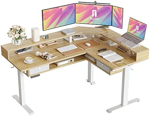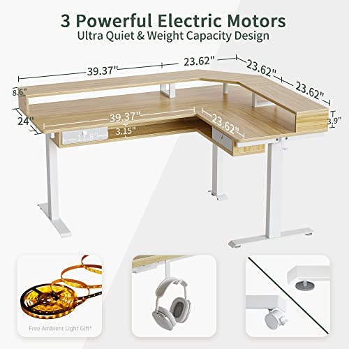 FEZIBO 63" L Shaped Standing Desk with LED Strip, Electric Triple Motor Sit Stand up Corner Desk Height Adjustable with Monitor Stand & Shelves, 2 Drawers, Ergonomic Home Office Desk, Natural