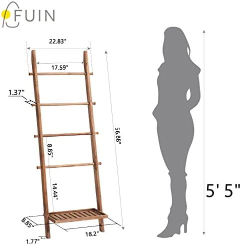 FUIN 5ft Wood Blanket Ladder with Bottom Shelf Decorative Wall Leaning Towel Rack Bathroom Storage Quilt Display Holder Rustic Farmhouse, Light Brown