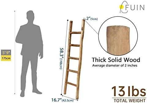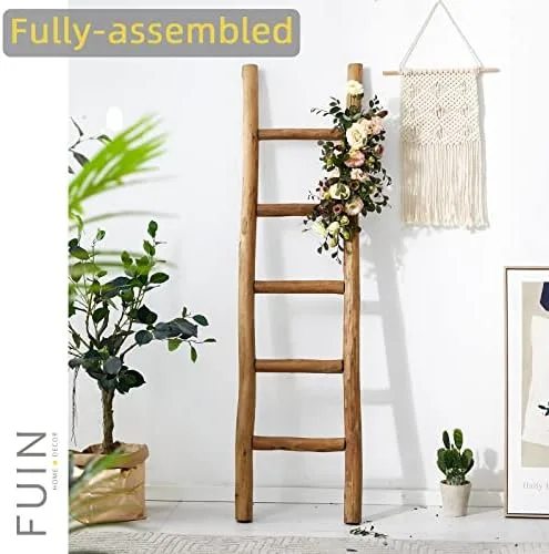FUIN Fully Assembled 5 Ft Wood Decorative Wall Leaning Blanket Ladders Bathroom Storage Quilt Towel Display Rack Shelf Holder Rustic Farmhouse, Brown