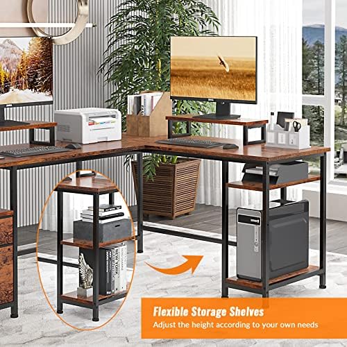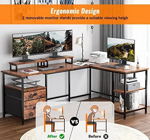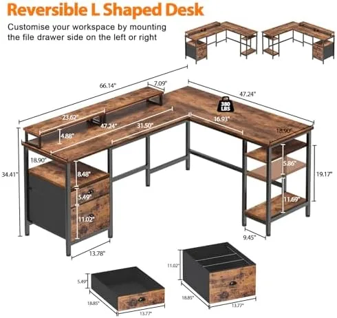 [66″ Extra Wide Desktop]: The size of the l-shaped desk is (66.1+47.2)”L*18.9″W*29.5″H, it has 3 open storage shelves, one fabric file cabinet and drawer increase additional space to meet different storage requirements, such as books, printers, monitors, files and so on; Ample bottom space allows you to rest your legs.