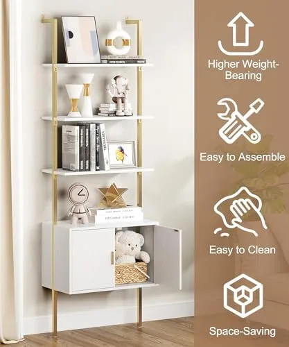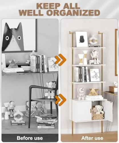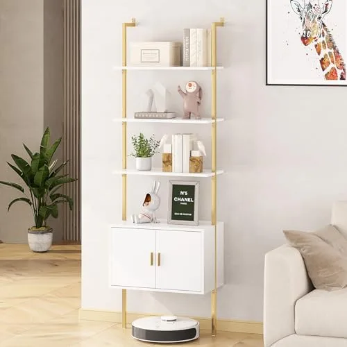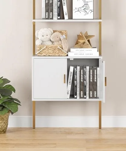 Gadroad 5 Tier Tall Bookshelf with Cabinet, 73" Modern Bookcase, Wall Mounted Ladder Bookshelf with Stable Metal Frame, Open Display Rack, Storage Shelves for Bedroom, Home Office, White Gold