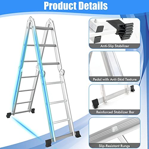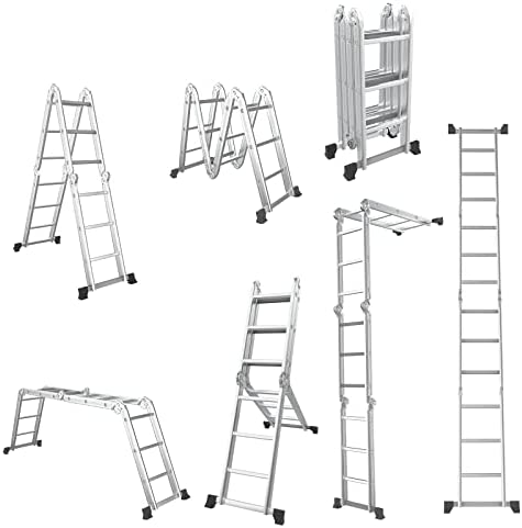 Giantex 7-in-1 aluminum ladder will help you solve various troubles in daily life. Consisting 4 sections which are connected by large and flexible joints, the ladder can be easily transformed into different shapes to satisfy your multiple demands. You can use it as a as straight ladder, step ladder, scaffold, overhang ladder, M-shaped ladder or staircase ladder. Made of premium aluminum alloy, the ladder features high stability and durability. And the anti-slip pedal, foot pads and side rungs ensure higher safety. Furthermore, the multi-joint design enables the ladder to be folded into a much compacter size, so you can carry or store it with less effort. If you are looking for a ladder for housework, this multifunctional folding ladder will be a perfect choice.