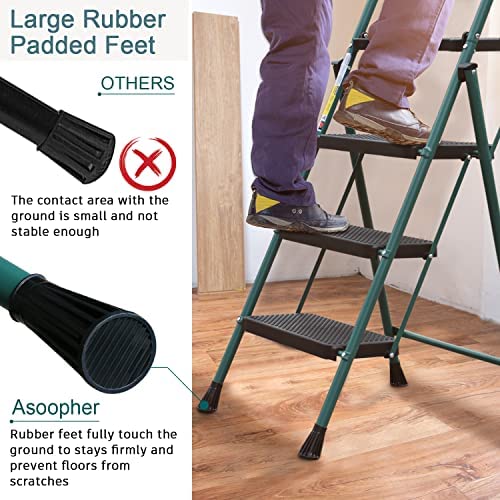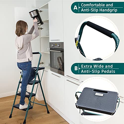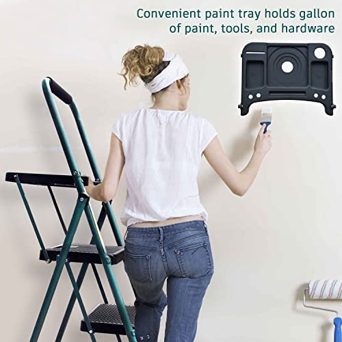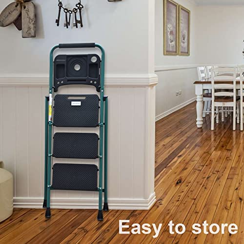 HBTower 3 Step Ladder with Tool Tray, Folding Step Stool with Wide Non-Slip Pedal and Comfort Handgrip for Household and Office, Lightweight 500lbs Capacity Step Ladder, Green