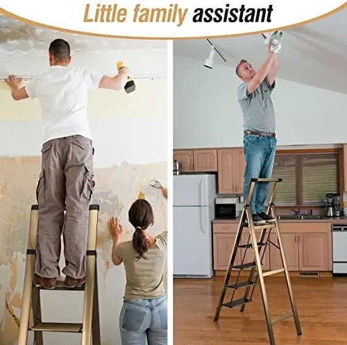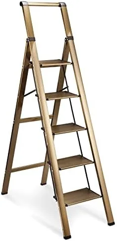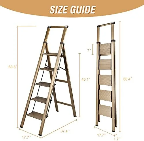 HBTower 5 Step Ladder, Aluminum Ladder with Handrails, Folding Step Stool for Adults, 330LBS Capacity Sturdy& Portable Ladder for Home Kitchen Library Office, Champagne Gold