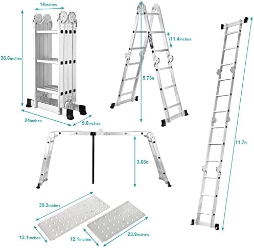 Space Saving & Easy Storage, Adjustable from 3.2ft to 11.7ft. The folding ladder can be unfolded to a great big to use, but the foldable design allows it not to take up so much space to store, N.W:45LBS, Folding Size: W24’x D9.8’ x H38.6’.