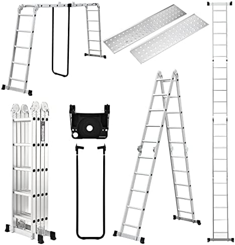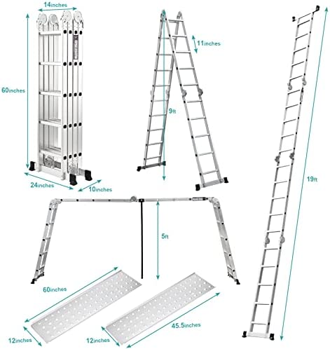 Space Saving & Easy Storage, Adjustable from 5ft to 19ft. The folding ladder can be unfolded to a great big to use, but the foldable design allows it not to take up so much space to store, N.W:52.9 LBS, Folding Size: W24’x D10’ x H60’.