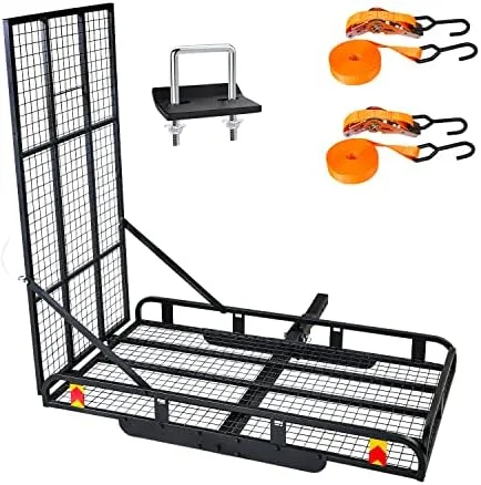 【Enhanced Safety】The cargo rack basket dimensions is 50” x 28.3”, 5.1” high sides rails of the cargo basket and upgraded with the addition of a adjustable limit-switch on the hitch tube to enhance the stability and provide extra security.