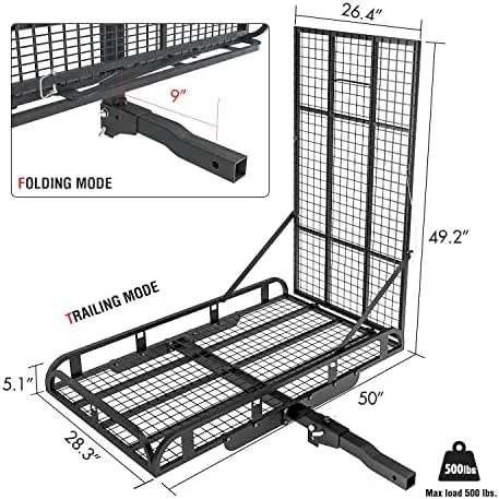 【Adaptable】the AA Cargo hitch carrier is equipped with a folding angled shank. It allows the cargo carrier to be folded up when not in use. Ideal for transport Lawn, wheelchairs, Scooters, bikes, gears and anything else.