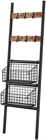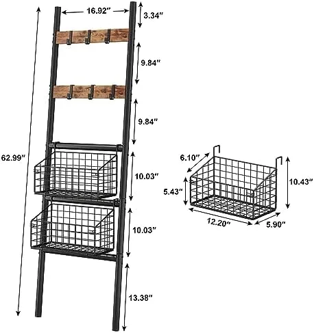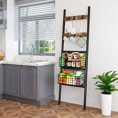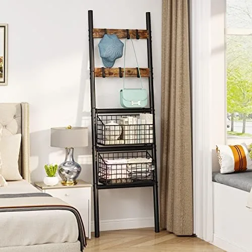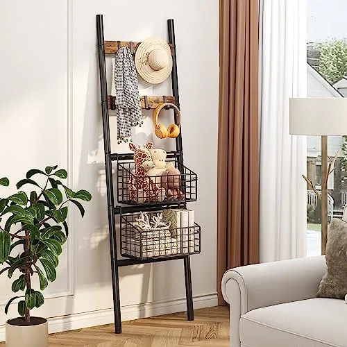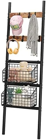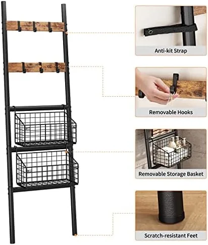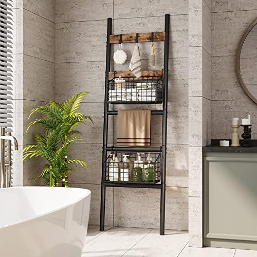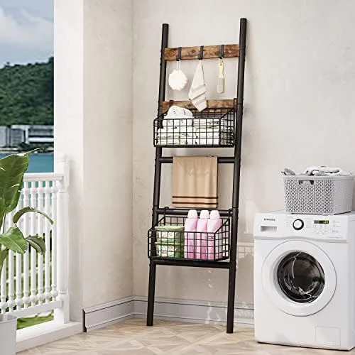 Foldable & Removable Storage Baskets – This towel ladder rack shelf equipped with 2 foldable and removable storage baskets for towels, books, toys, shampoo, shower gel, fruits and vegetables, and various condiment bottles.